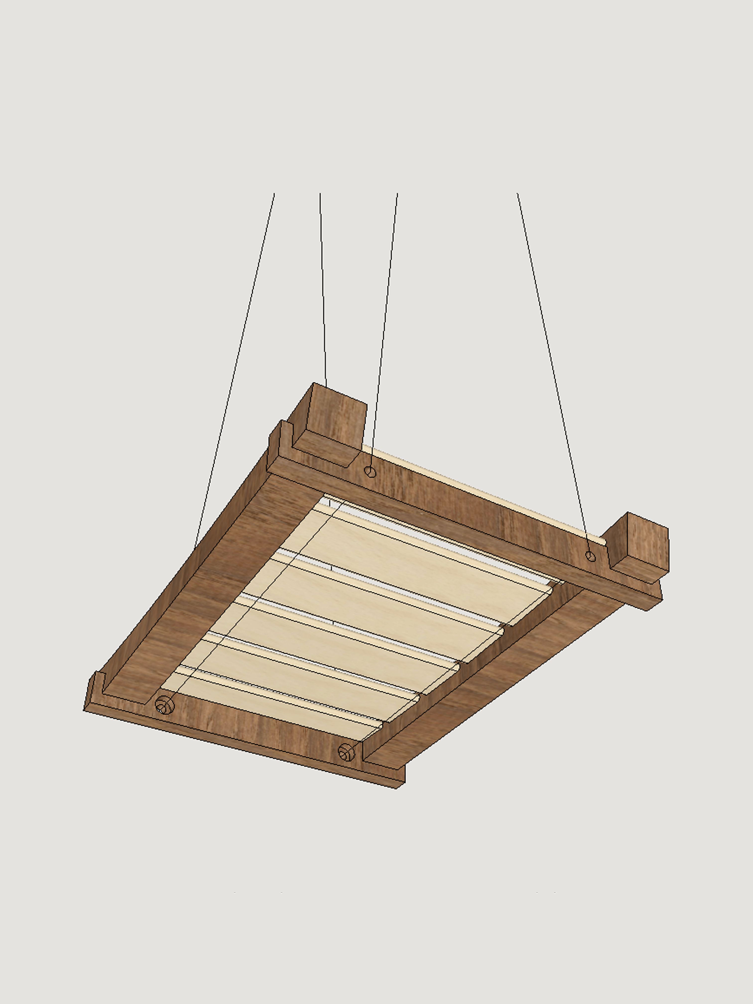 • Mortaises du lattage (Érable) faites une-à-une dans les traverses (Noyer) : courbe