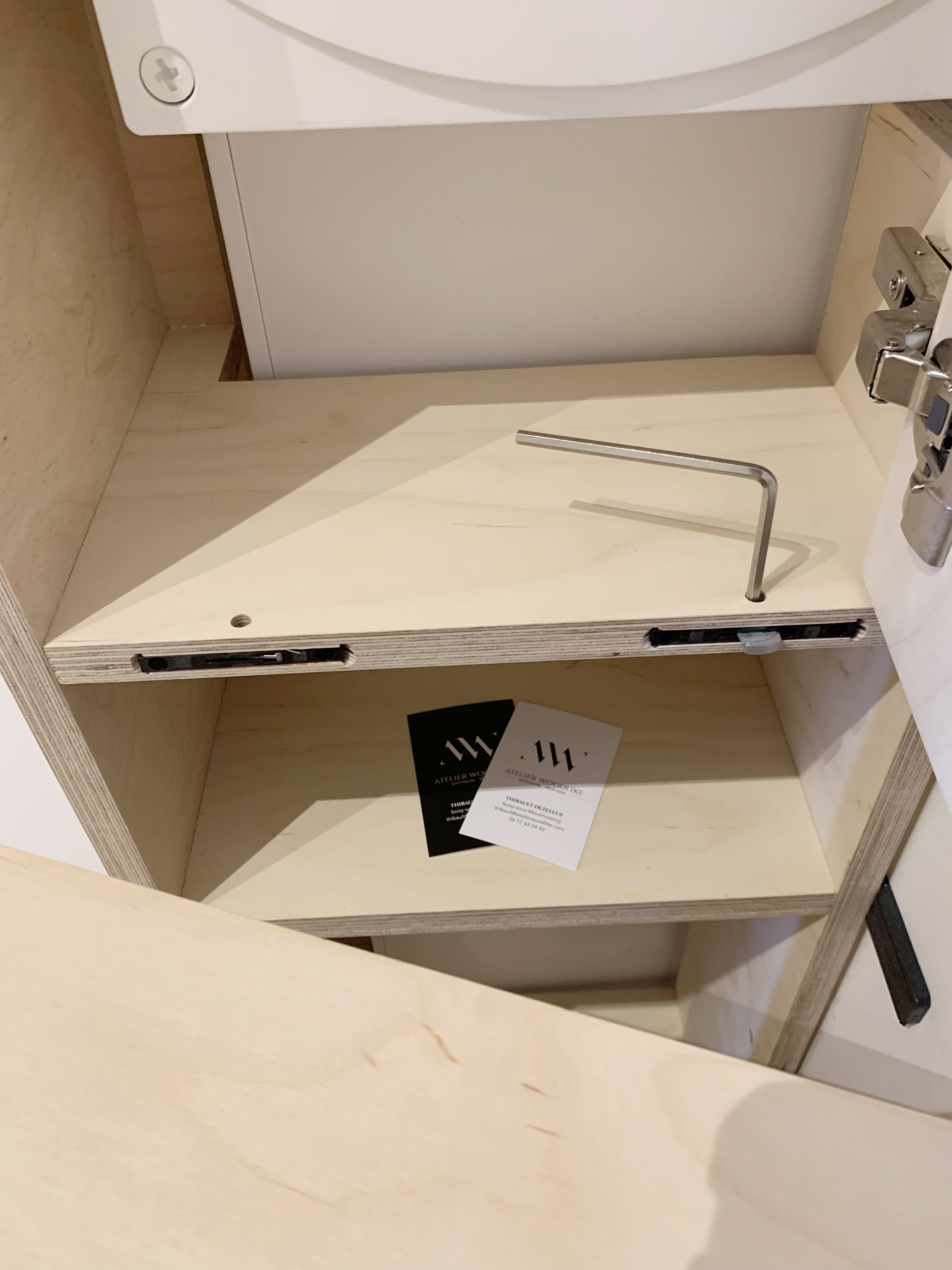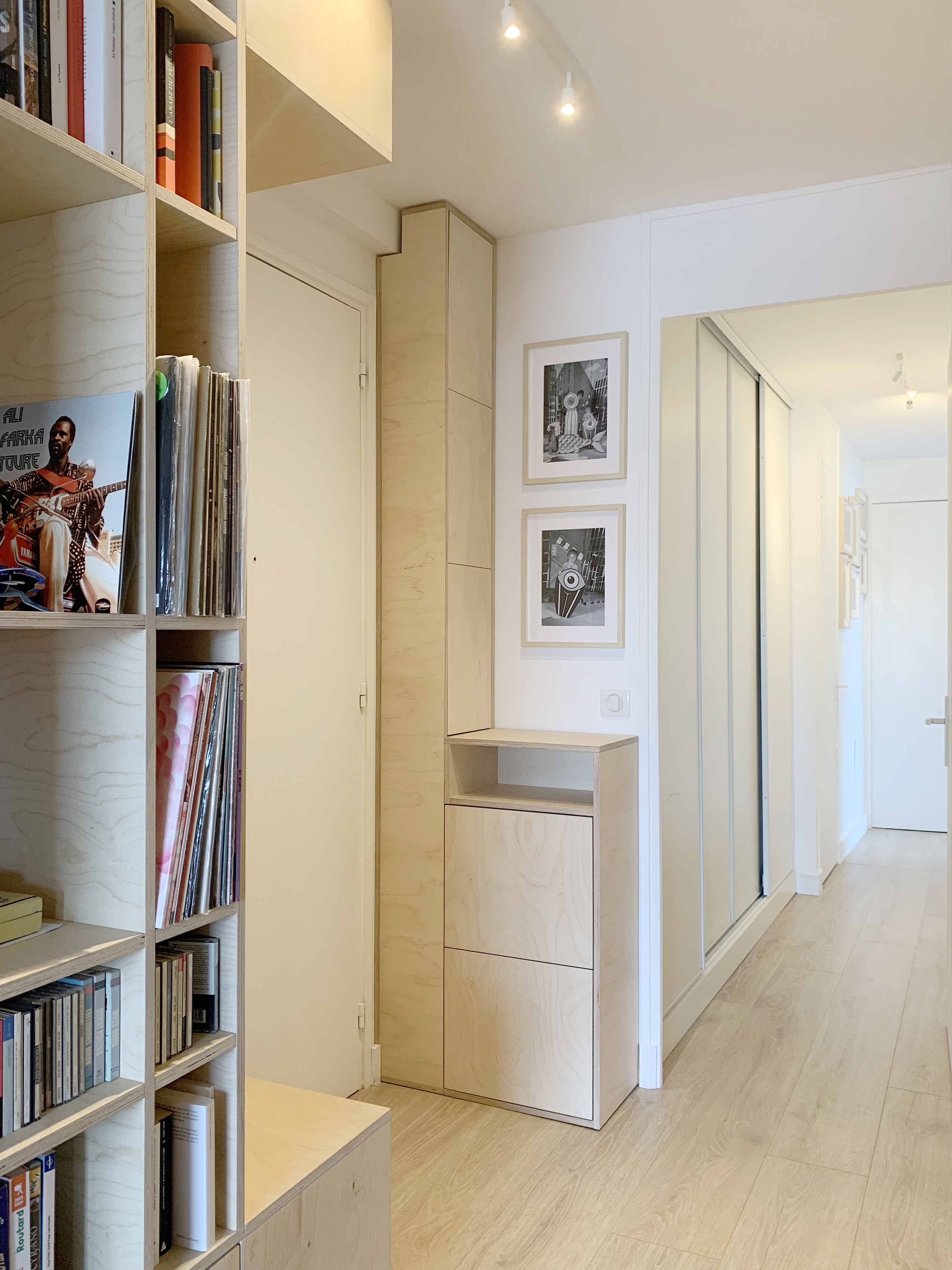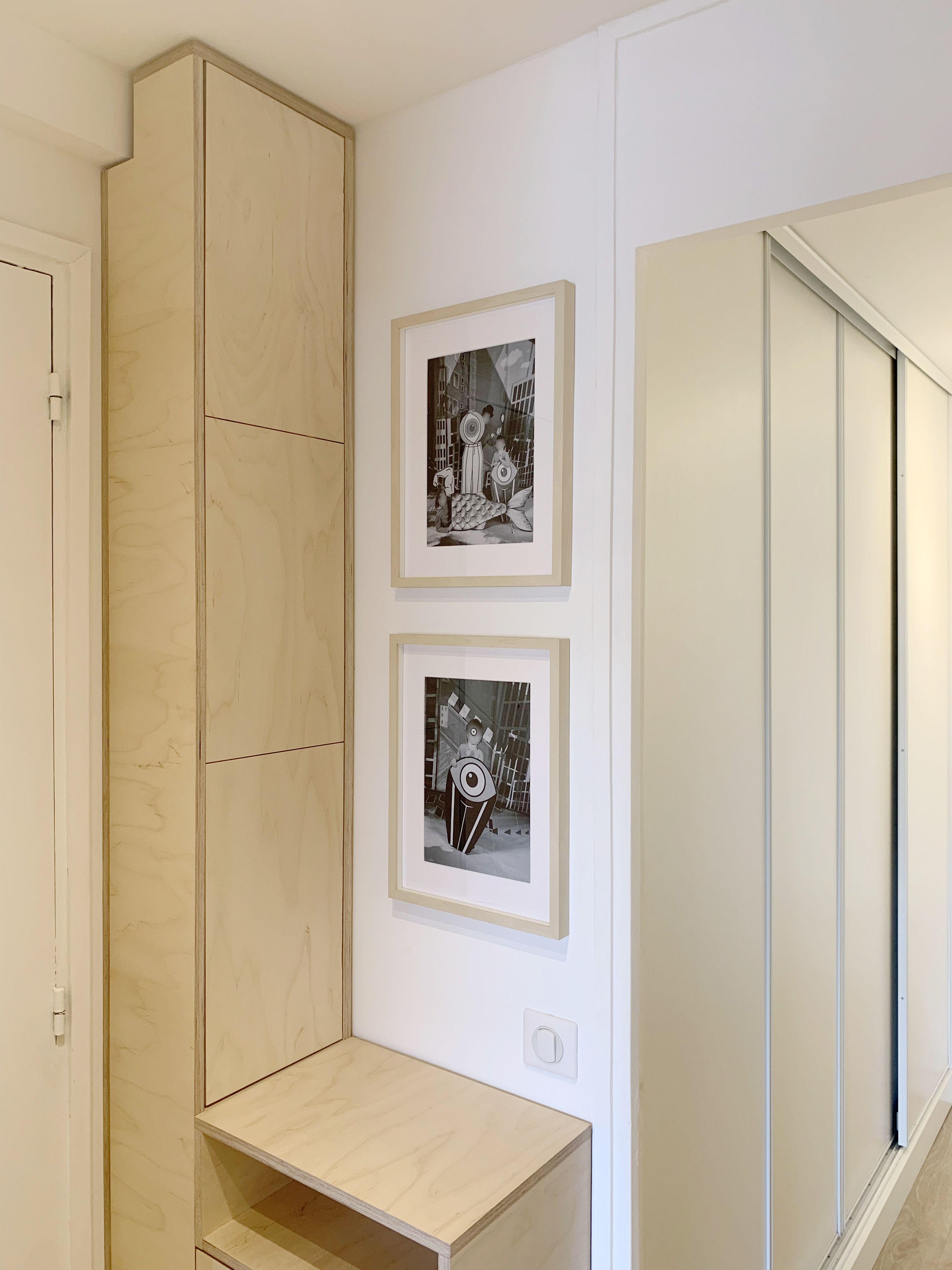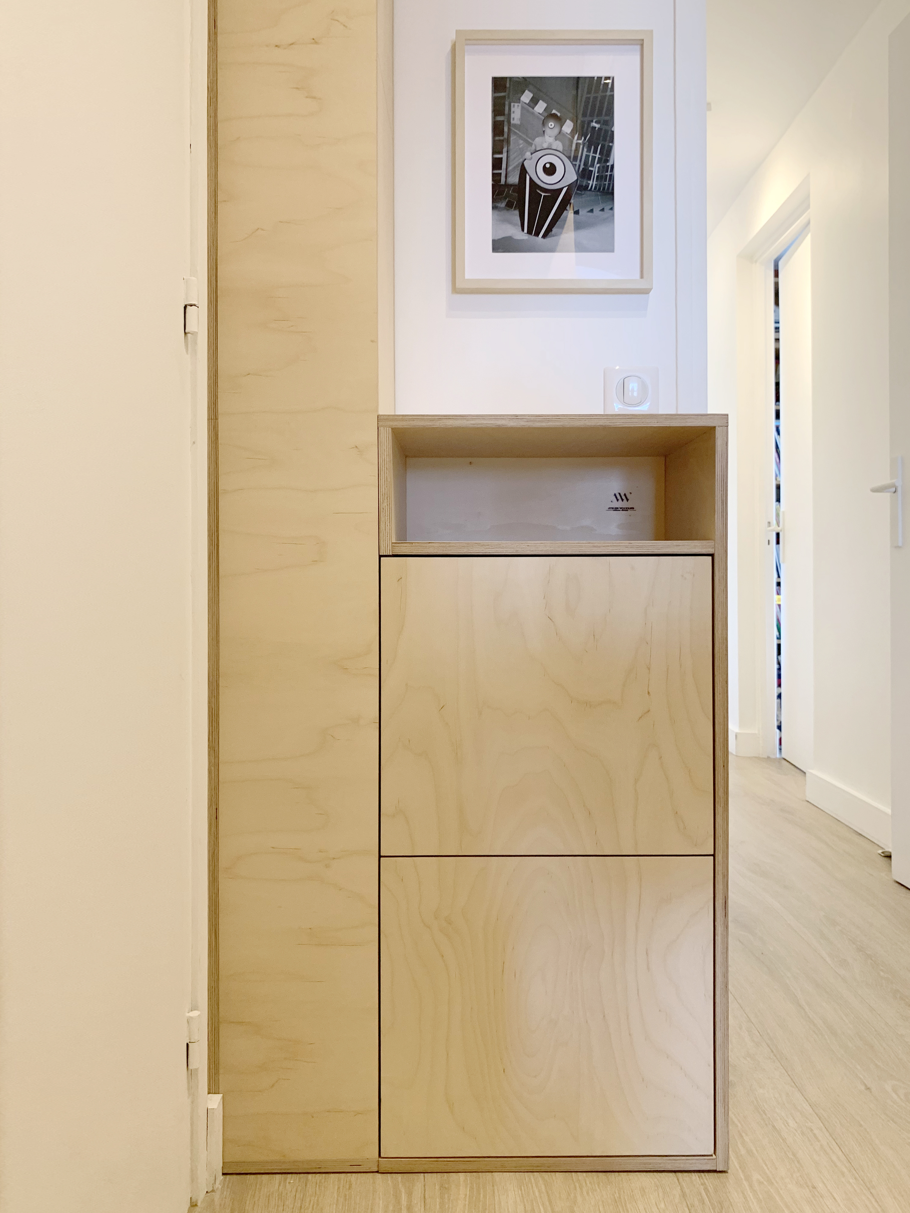 Installé dans un bel appartement Parisien, ce meuble vide-poche prend place dans un petit hall d’entrée bien connu, puisqu’il fait face au meuble à chaussures et à la grande bibliothèque murale sorties de l’ATELIER WOODLIKE quelques temps plus tôt !