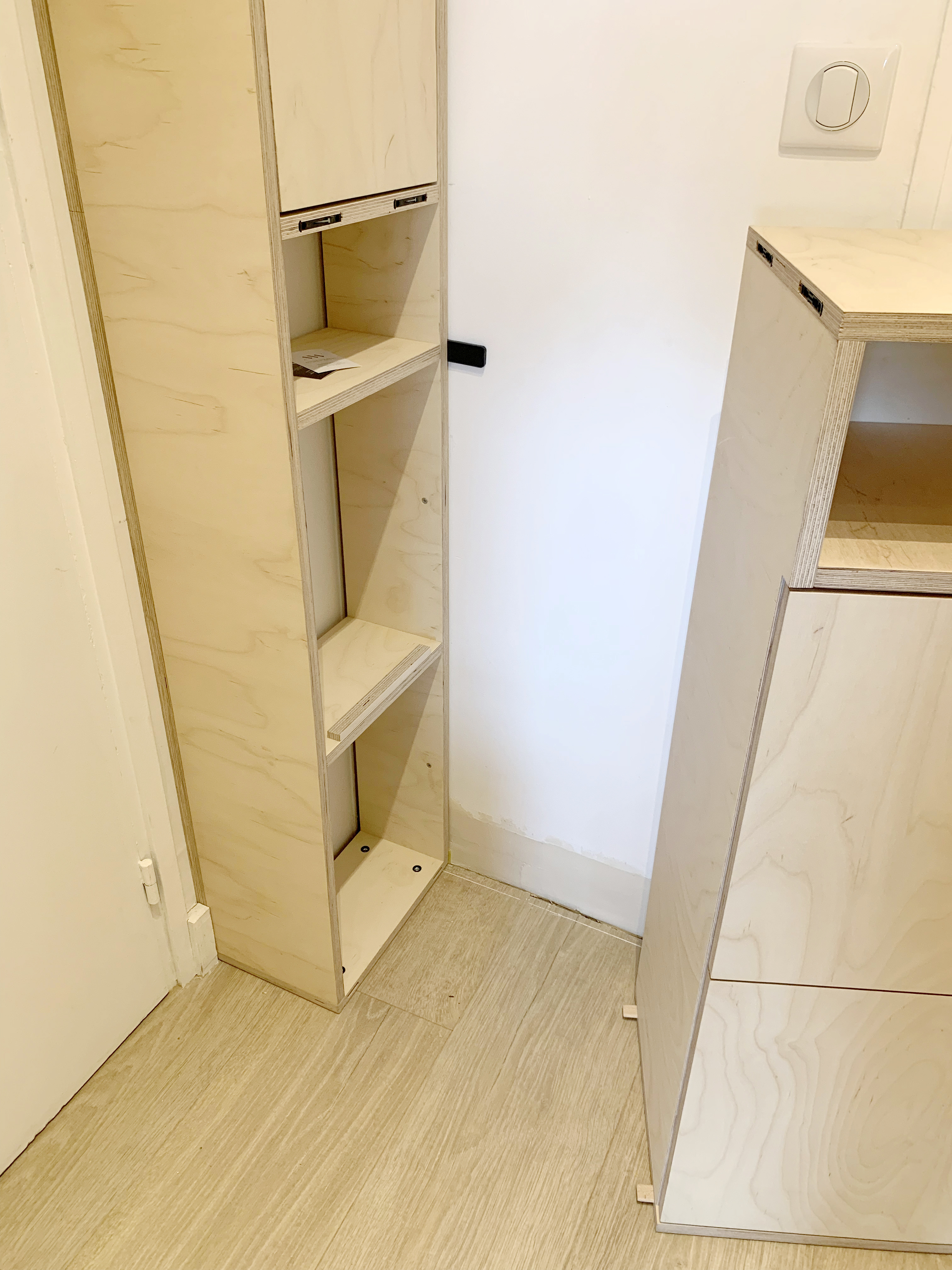 Destiné à recevoir les équipements des trois enfants qui rentrent de l’école en trottinettes, le caisson bas est mobile afin de permettre à la porte d’entrée d’ouvrir le plus largement possible en cas de besoin. En déverrouillant deux petits ergots, cachés dans la colonne, on peut désolidariser les deux éléments pour dégager le passage au maximum, comme si le meuble n’était tout simplement pas là.