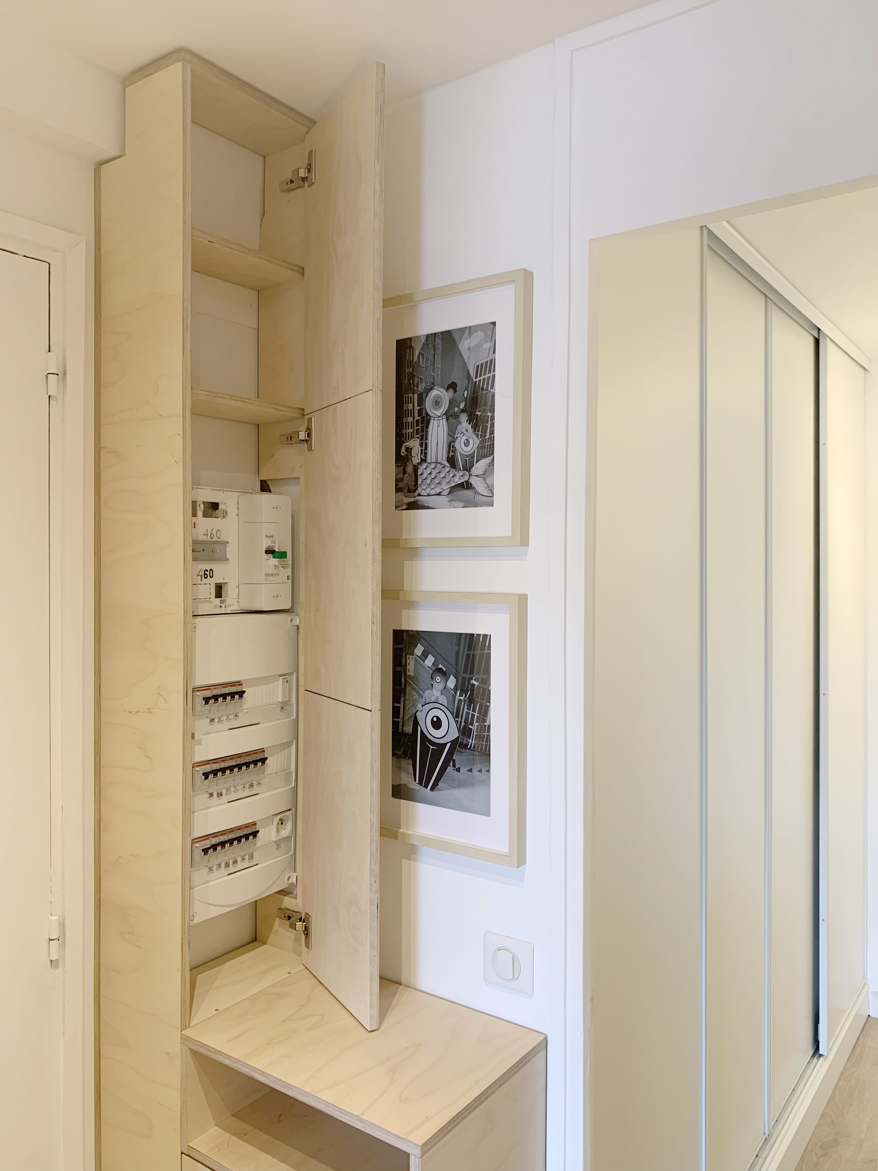 La colonne, dissimulant le tableau électrique et les installations télécoms, est fixe. On y trouve quelques crochets destinés à suspendre des clés en partie haute ainsi qu’une « cachette » – dissimulée par l’élément mobile – en partie basse.
