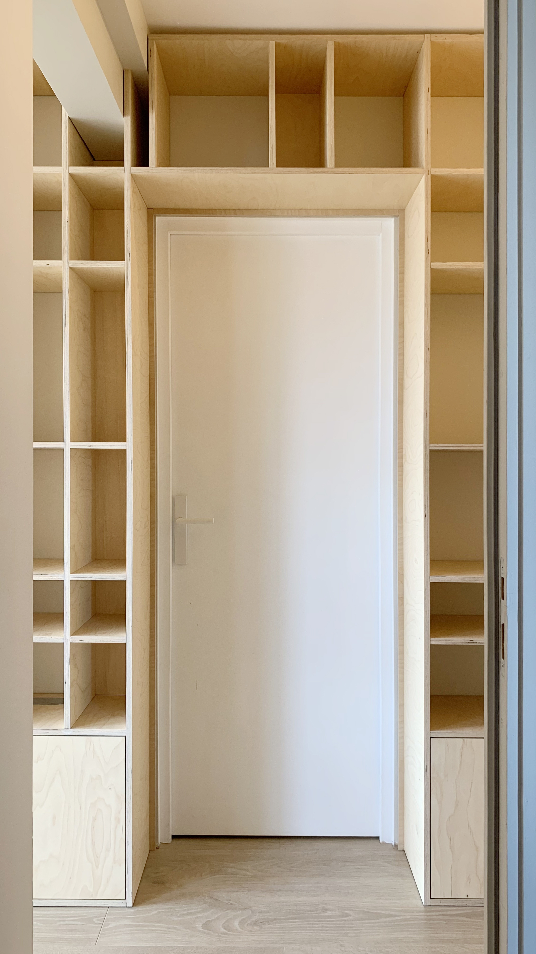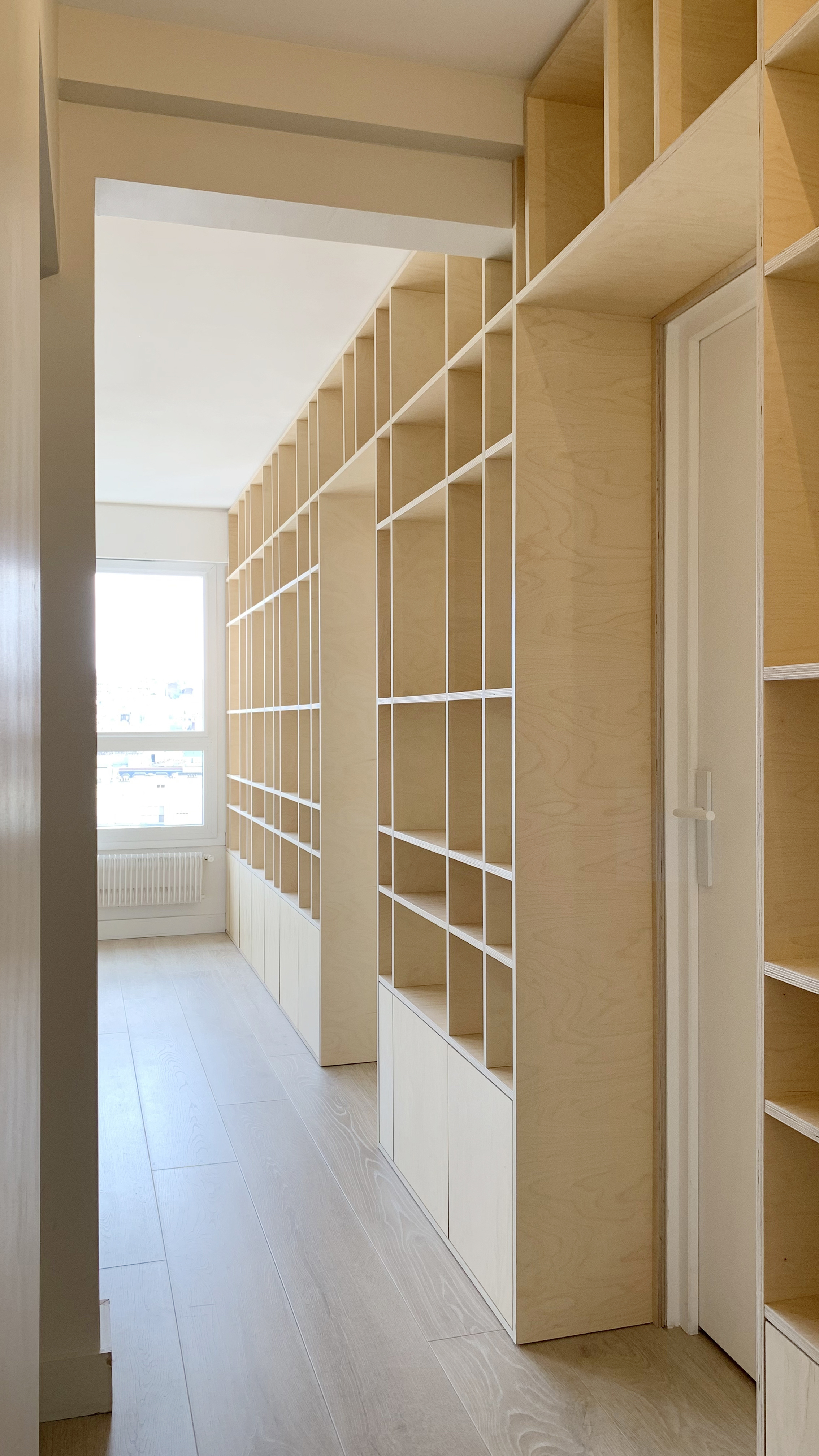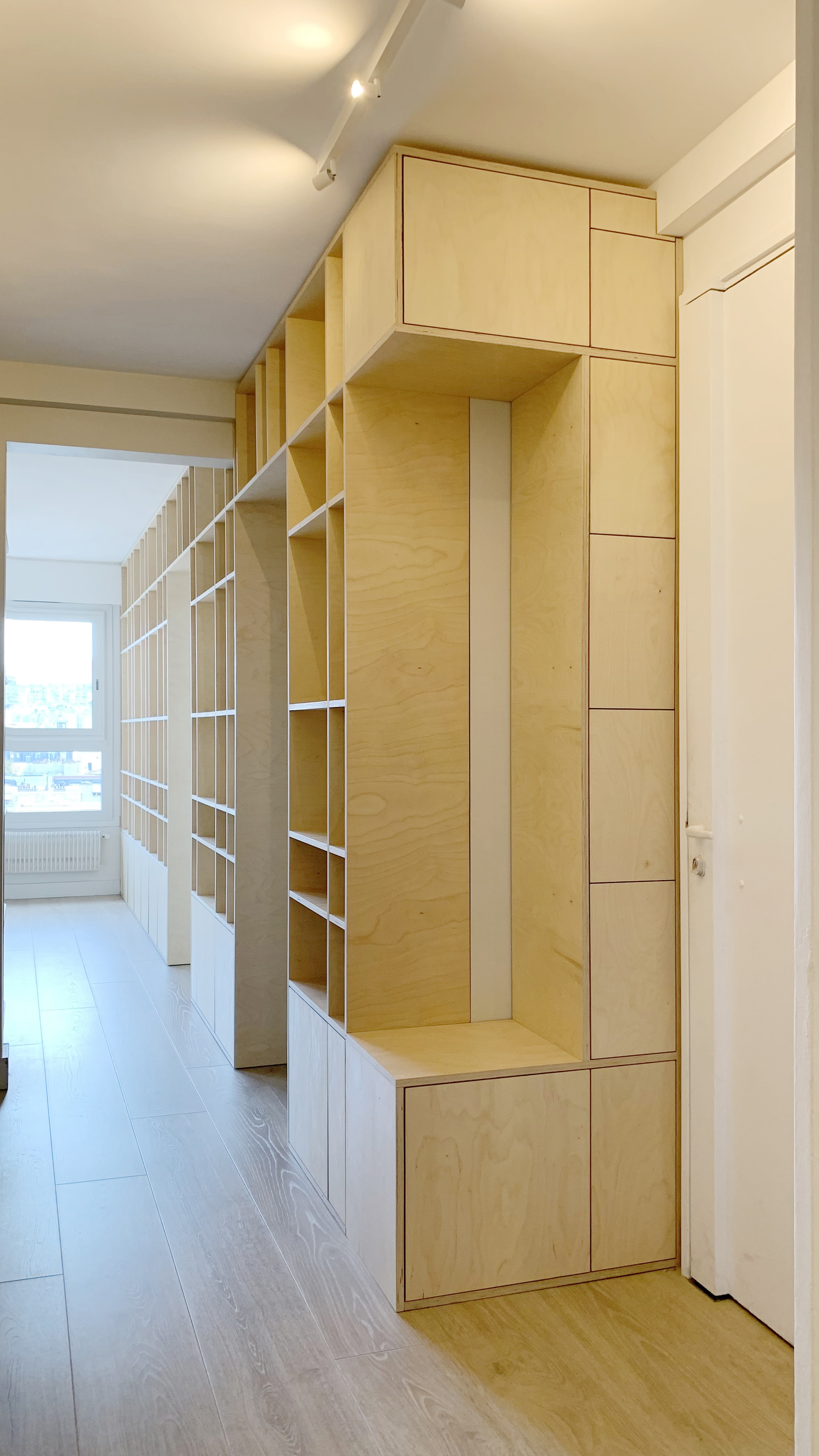 Filant dans le couloir depuis le séjour, cette composition se retourne dans le hall et créée un meuble à chaussures pour toute la famille. Afin de réduire visuellement le volume de cet ensemble depuis l’entrée de l’appartement, l’angle est « traité en creux ». L’alcôve qui en résulte permet d’installer une assise bienvenue dans un hall d’entrée.
