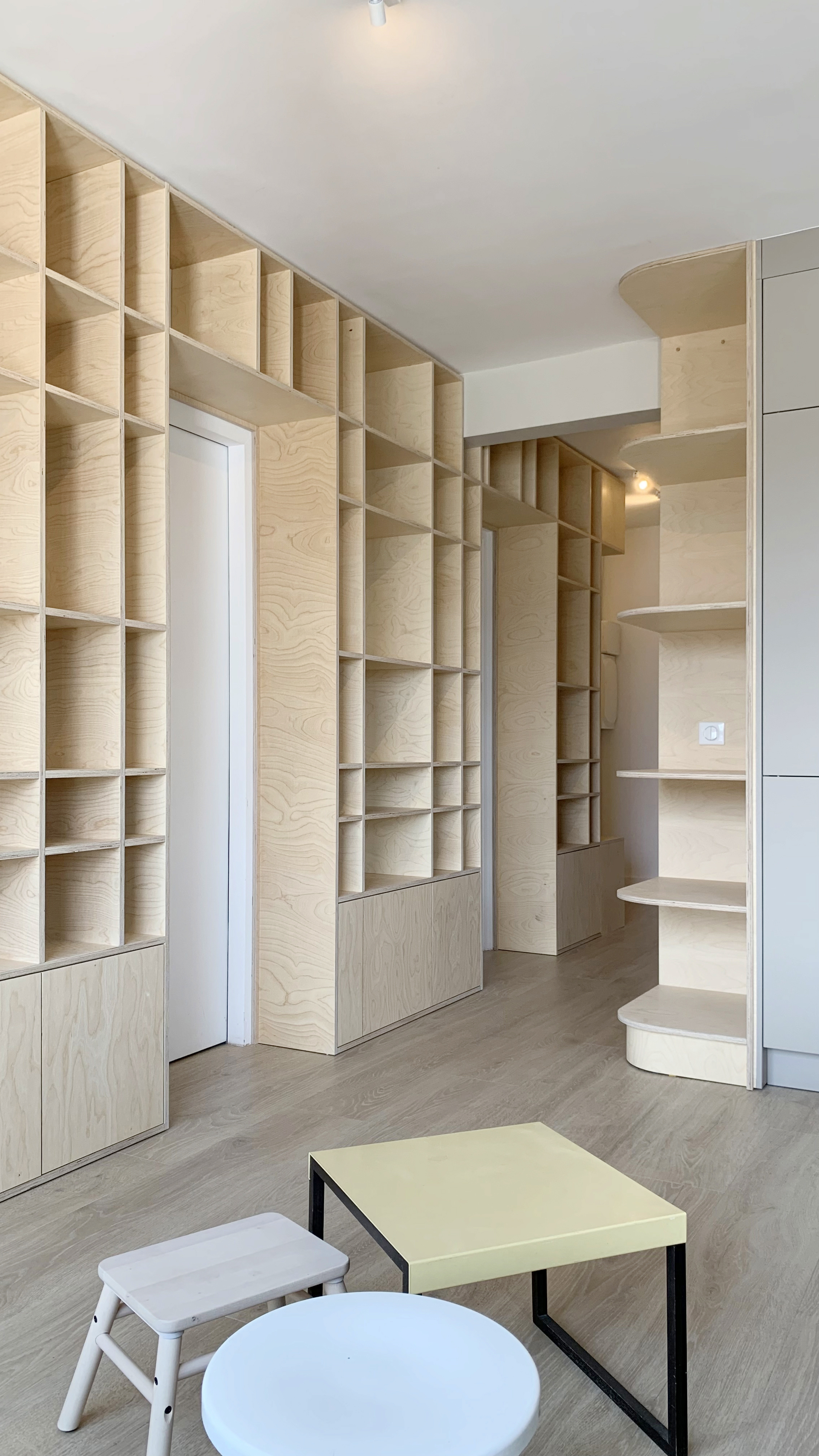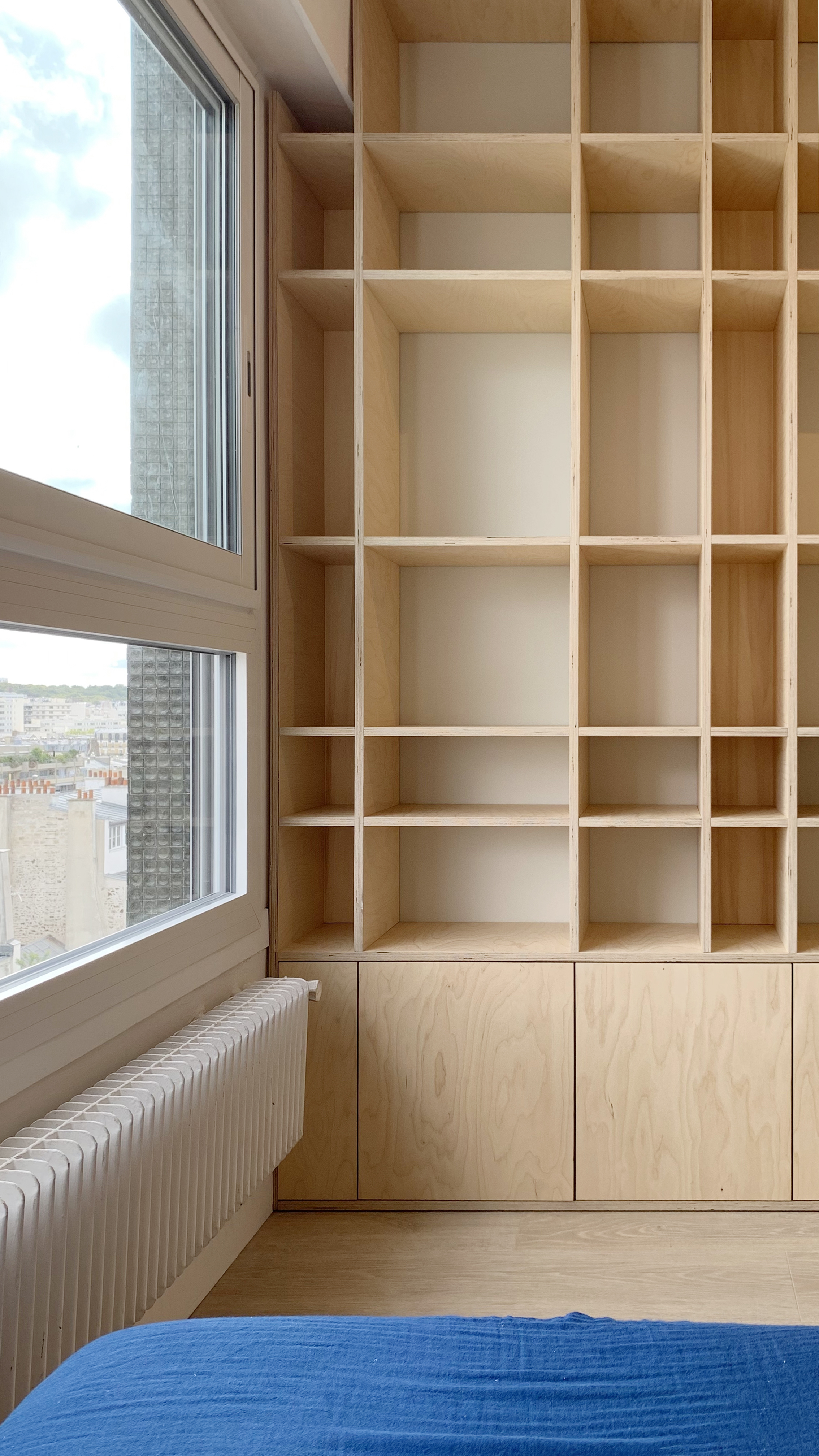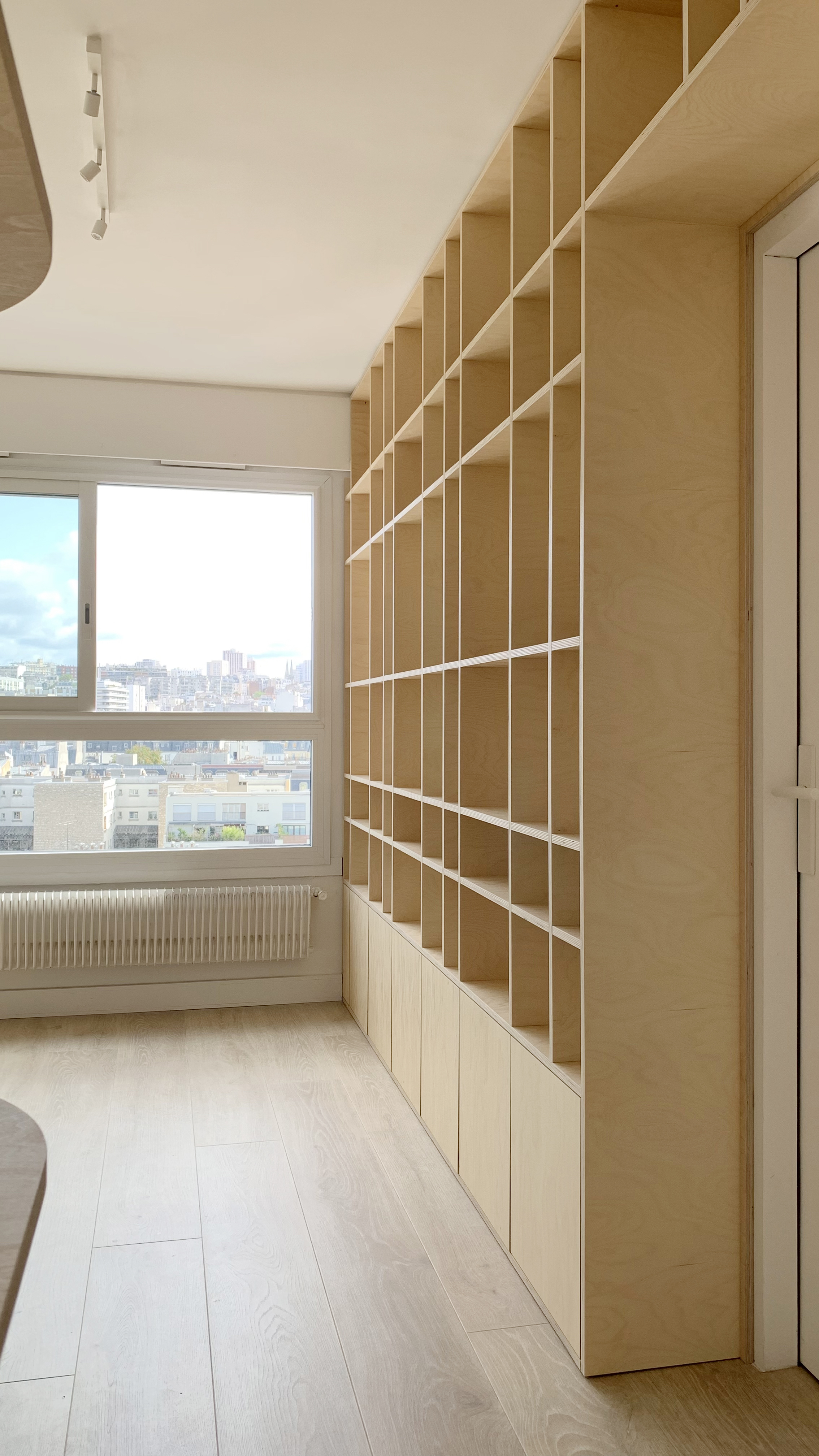 Située dans un bel appartement Parisien, cette immense bibliothèque permet enfin aux membres de la famille – tous férus de lecture, de musique, de dessin et d’art plastique – de pouvoir ranger et retrouver facilement leurs œuvres préférées.