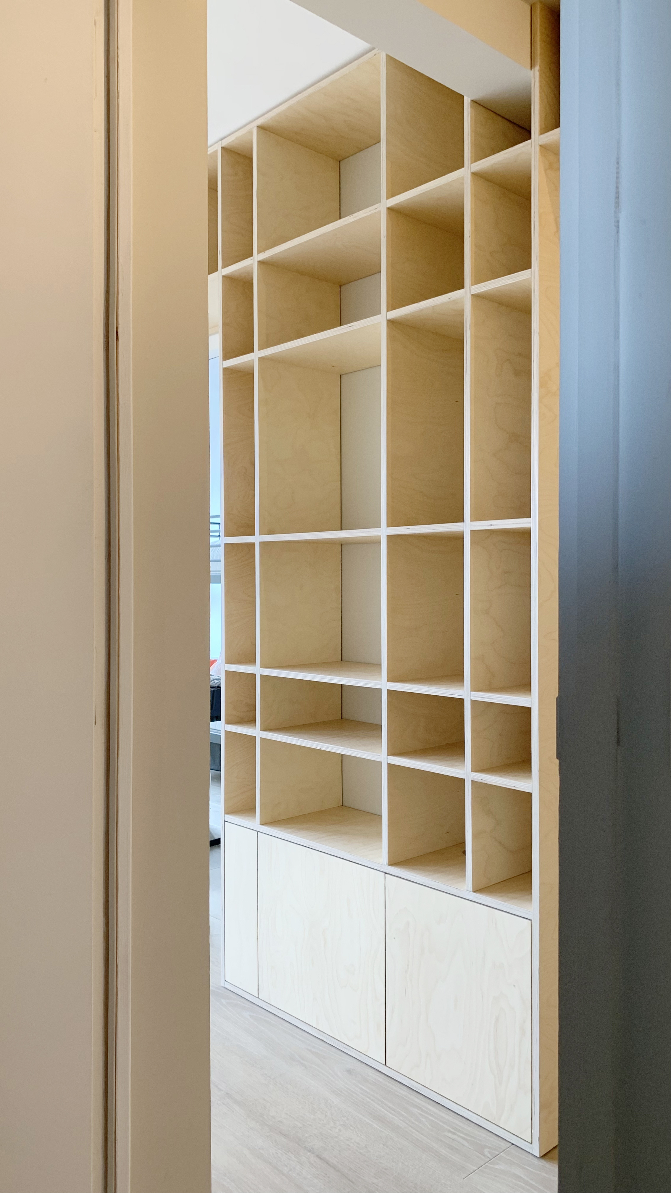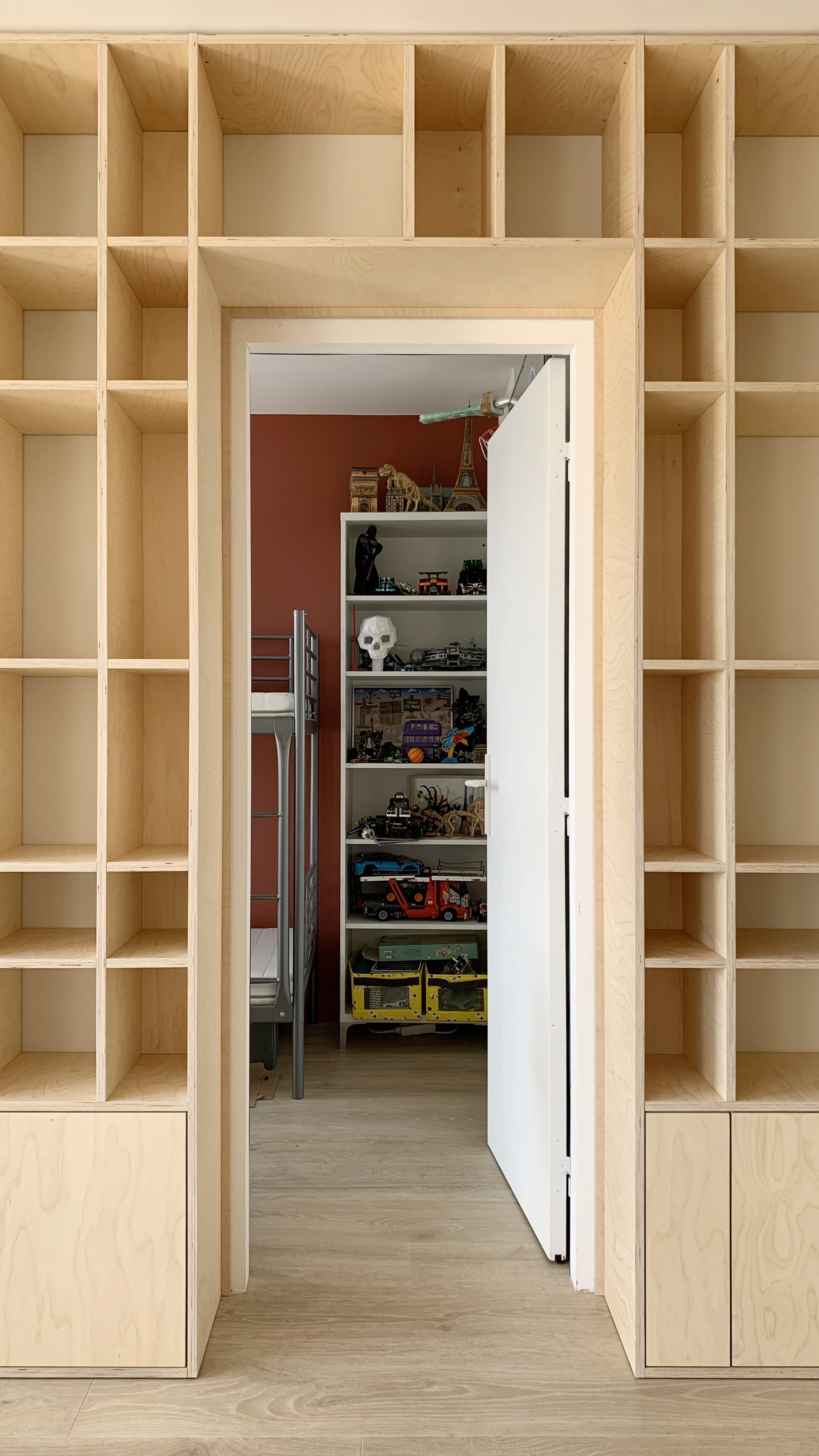 Conçue pour être à la fois une étagère, présentant les œuvres plastique de la maitresse de maison à hauteur d’yeux, et une bibliothèque, portant les livres et les disques préférés de monsieur à portée de main depuis le canapé, les parties basses dissimulent discrètement les trésors de leurs trois enfants derrière leurs portes.