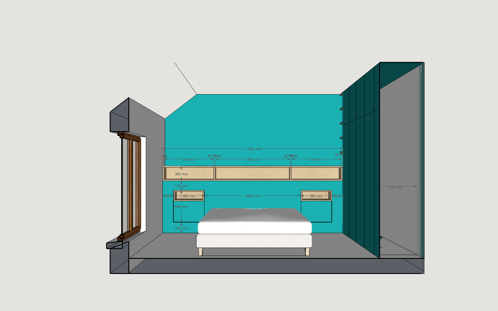 • Tête-de-lit : L: 3,36 m – H: 1,30 m – P: 250 mm