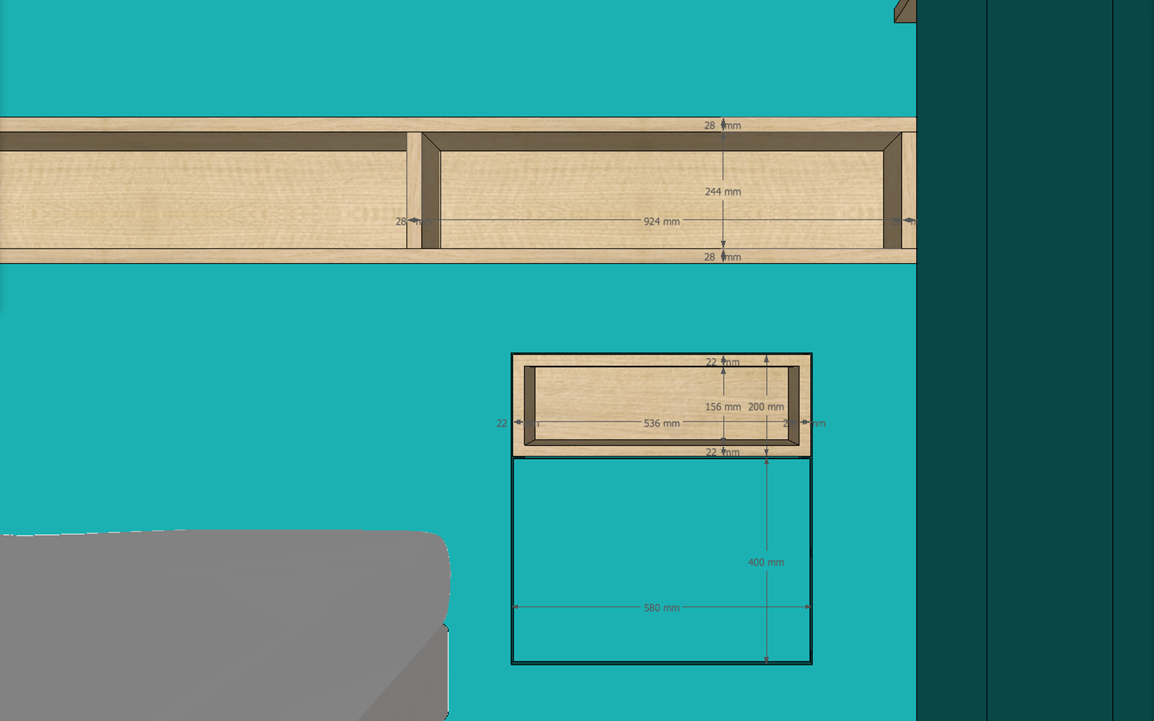 Élément le plus technique des trois, la tête-de-lit intègre tout un ensemble d’équipements électriques. Le grand caisson (en contreplaqué bouleau) accueil deux bandeaux LED à intensité variable (un par côté du lit), commandés depuis les deux petits caissons des chevets. Équipés de prises électrique, ces derniers permettent également de commander le luminaire du plafonnier.